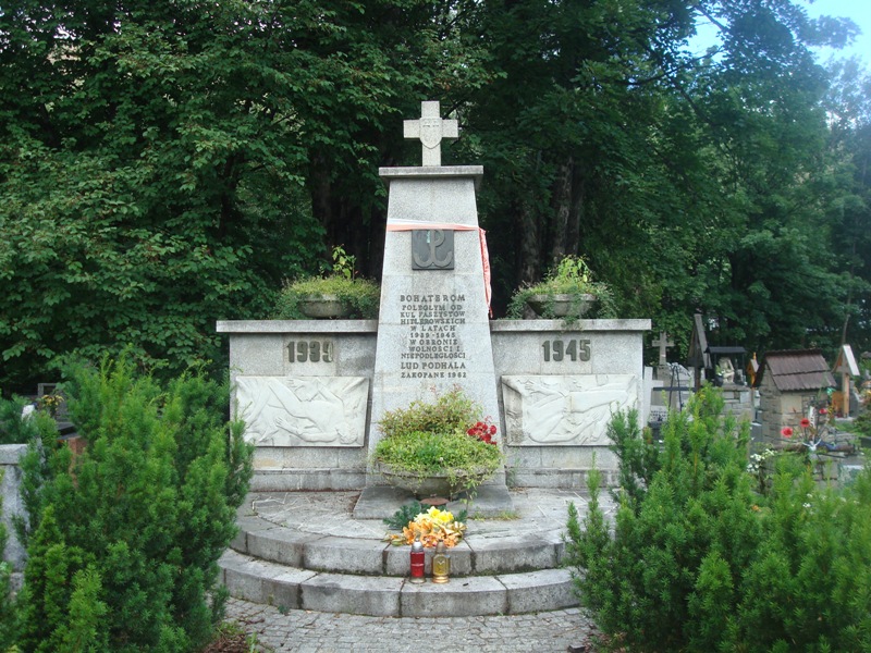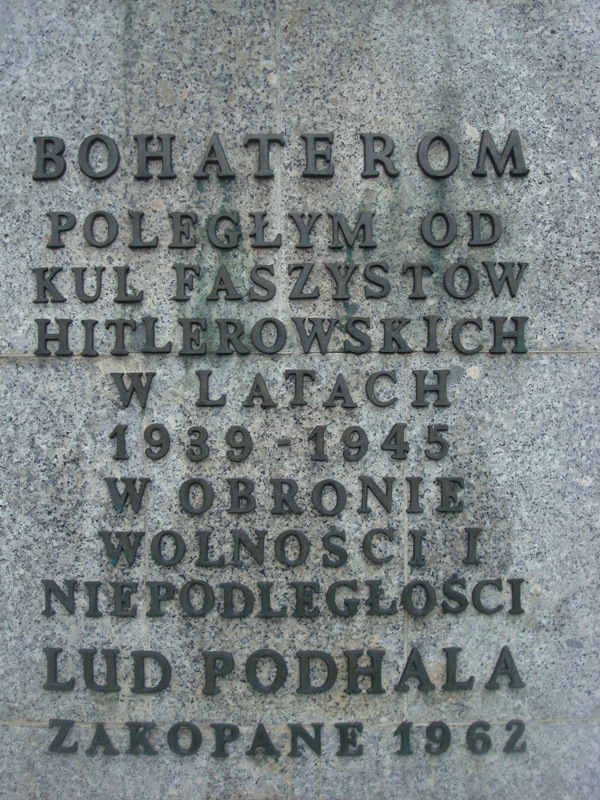 Na mogile ściana pomnikowa z wysokim postumentem zwieńczonym krzyżem łacińskim. Na ścianie pomnikowej wyryto daty „1939 1945” oraz umieszczono prostokątne tablice z płaskorzeźbami. Na postumencie znajduje się tablica ze znakiem „Polski Walczącej” i napisem „BOHATEROM/ POLEGŁYM OD KUL FASZYSTÓW/ HITLEROWSKICH/ W LATACH/ 1939 – 1945/ W OBRONIE WOLNOŚCI I/ NIEPODLEGŁOŚCI/ LUD PODHALA/ ZAKOPANE 1962”.