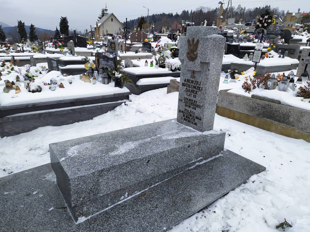 Na mogile nagrobek z szarego granitu z wysoką stelą u wezgłowia zakończoną ryzalitowanym równoramiennym krzyżem, na którym umieszczona jest metalowa plakieta przedstawiająca orła wojskowego. Na steli licu steli umieszczony jest napis wykonany z metalowych liter: Ś.†P./ ANDRZEJ/ BUDOWSKI/ „DANEK"/ LAT 22/ ŻOŁNIERZ/ O.P. „SZCZERBIEC"/ NOW–AK/ POLEGŁ/ 13 WRZEŚNIA 1944 R./ W WALCE/ Z NIEMCAMI.
