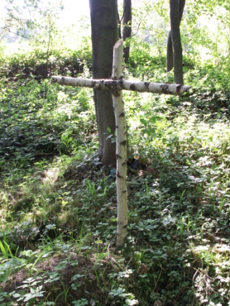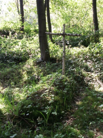 Mogiła ziemna z brzozowym krzyżem u wezgłowia. Pochowano tu nieznanego żołnierza poległego w czasie II wojny światowej.