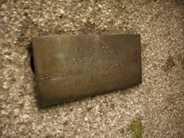 Poniżej napisu odwzorowane są dwa skrzyżowane proporce i hełm. Nad tablicą memoratywną znajduje się prostokątna metalowa tabliczka z napisem: „TYM MIEJSCEM/ OPIEKUJE SIĘ/ PREZYDIUM GRN I SZKOŁA POD/ W ŁAPCZYCY”.