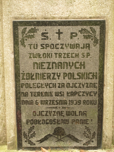 Mogiła ziemna w betonowym obramowaniu o wymiarach 204x245 cm. U wezgłowia mogiły znajduje się pomnik w formie trzech połączonych ze sobą postumentów. Najwyższy – środkowy postument, zwieńczony jest niskim krzyżem łacińskim z metalową figurą Chrystusa. W ścianę środkowego postumentu wmurowano tablicę memoratywną z motywem liści dębu i napisem : „Ś.†P./ TU SPOCZYWAJĄ/ ZWŁOKI TRZECH Ś.P./ NIEZNANYCH/ ŻOŁNIERZY POLSKICH/ POLEGŁYCH ZA OJCZYZNĘ/ NA TERENIE WSI ŁAPCZYCY/ DNIA 6 WRZEŚNIA 1939 ROKU/ OJCZYZNĘ WOLNĄ/ POBŁOGOSŁAW PANIE!”.
