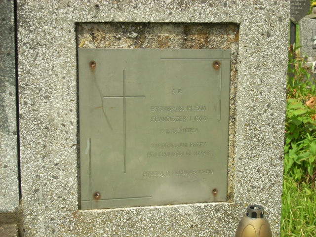 Mogiła ziemna w betonowym obramowaniu. U wezgłowia lastrykowa stela z krzyżem łacińskim z metalową figurą Chrystusa i tablicą memoratywną po prawej stronie z napisem: „Ś.P./ BRONISŁAW PLEWA/ FRANCISZEK LIGAS/ Z LUDŹMIERZA/ ZAMORDOWANI PRZEZ/ HITLEROWCÓW W 1939 R./ PROSZĄ O ZDROWAŚ MARIO”.