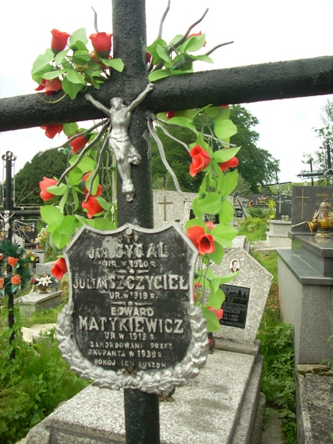 Mogiła ziemna, w betonowym obramowaniu, u wezgłowia krzyż z żelaznych rur. Na krzyżu umieszczona jest metalowa tabliczka w kształcie tarczy z napisem: „چP/ JAN CYCAL/ UR. W 1920 r./ JULIAN SZCZYGIEŁ/ UR. W 1919 R./ EDWARD/ Matysiewicz/ UR. W 1919 R./ ZAMORDOWANI PRZEZ/ OKUPANTA W 1939 R./ POKÓJ ICH DUSZOM”