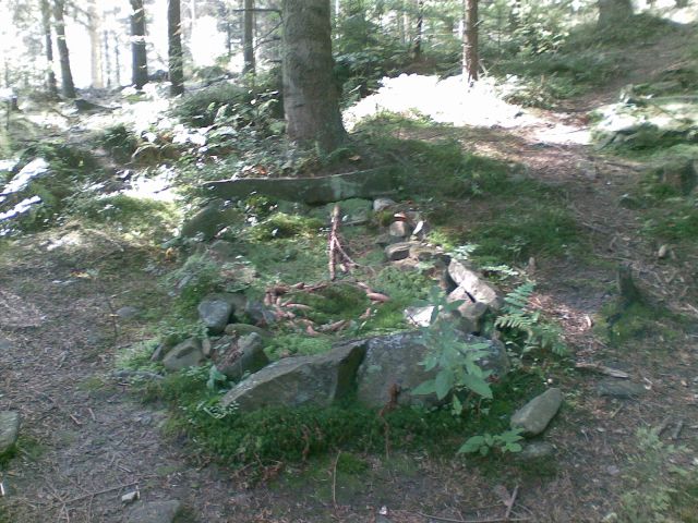 Mogiła ziemna, otoczona kamieniami i porośnięta mchem. Na mogile umieszczony poziomo krzyż z gałęzi.