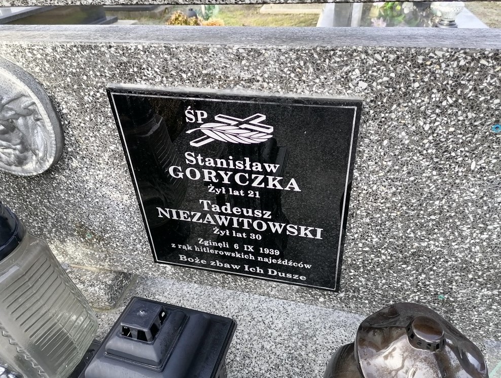 Pochowani tu Stanisław Goryczka i Tadeusz Niezabitowski zostali rozstrzelani przez żołnierzy niemieckich w dniu 6 września 1939 r.