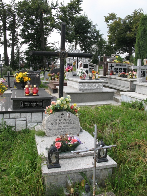 Mogiła obramowana i nakryta granitową płytą. U wezgłowia mogiły znajduje się wysoki krzyż z metalowych rur, z medalionem z głową Chrystusa i promienistą glorią na skrzyżowaniu ramion. O podstawę krzyża oparta jest granitowa tablica o nieregularnym kształcie ze zdjęciem zmarłego i napisem: „Ś.†P./ DR SZCZEPAN/ NIEDŹWIEDŹ/ 24.05.1902 r./ BESTIALSKO ZAMORDOWANY/ 02.06.1946 r./ JEZU UFAM TOBIE”.