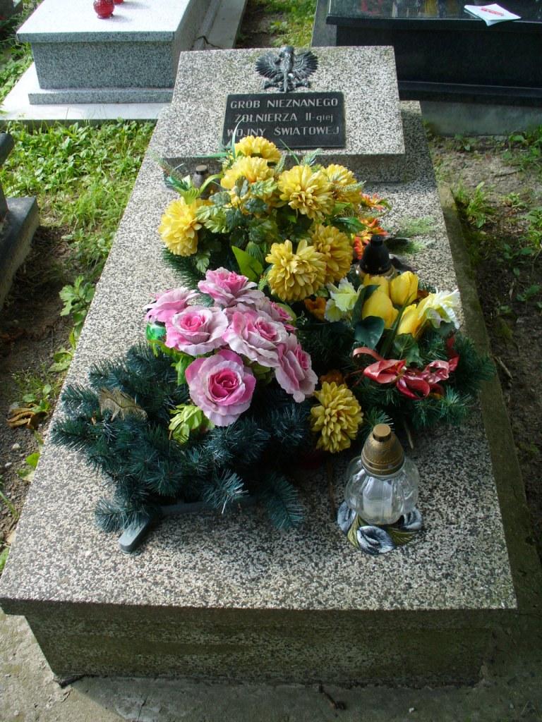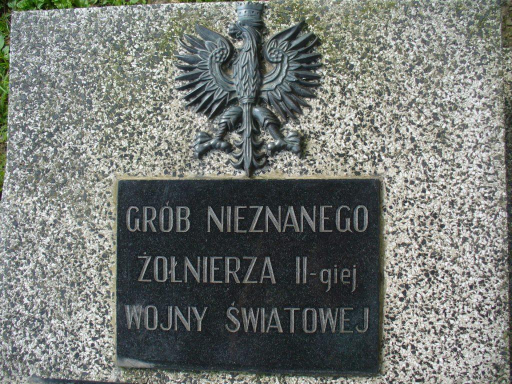 Mogiła obramowana i nakryta lastrykową płytą, u wezgłowia ścięty pulpitowo lastrykowy blok z metalowym emblematem przedstawiającym orła w koronie i z tablicą z ciemnego kamienia z napisem: „GRÓB NIEZNANEGO/ ŻOŁNIERZA II-giej/ WOJNY ŚWIATOWEJ".