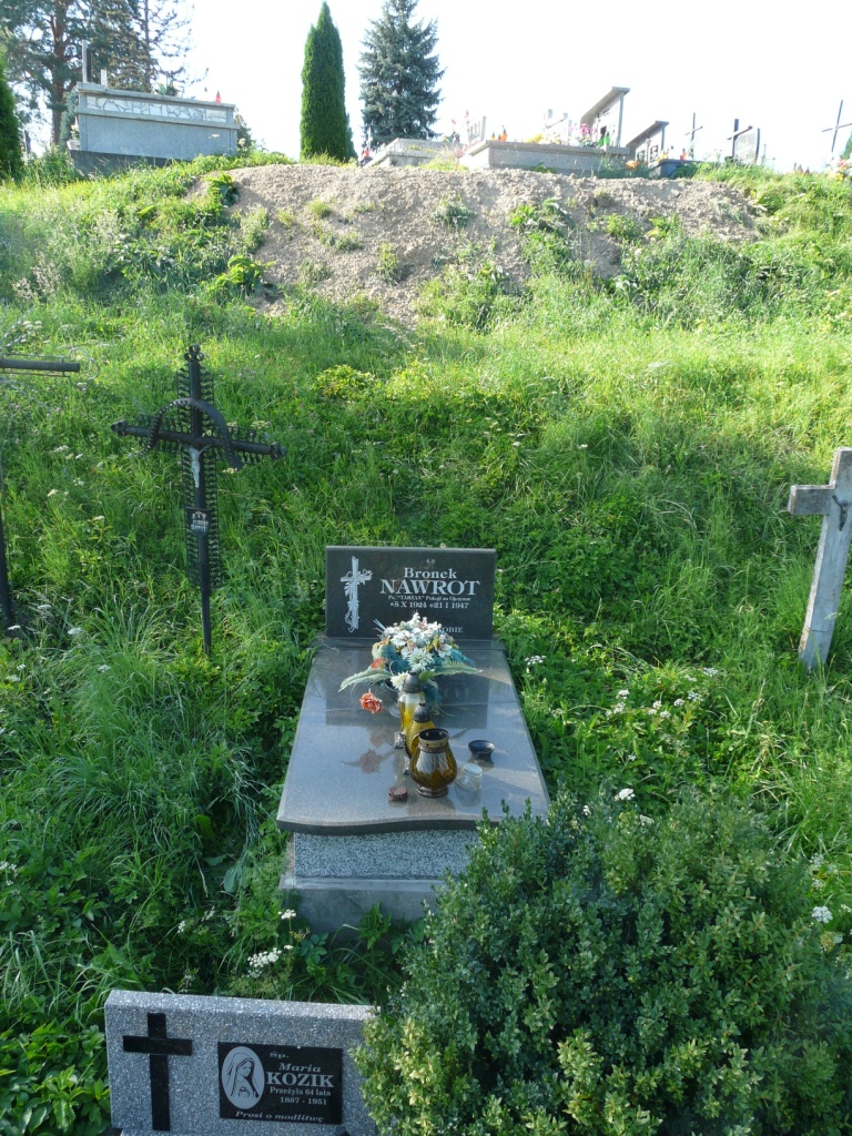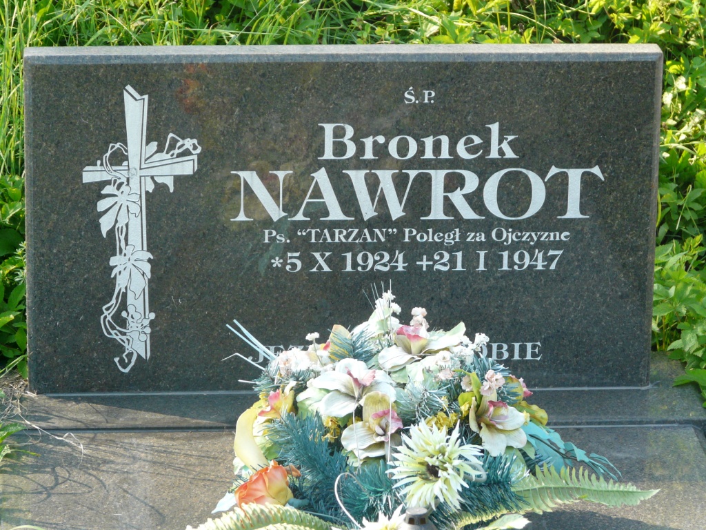Mogiła w lastrykowym obramowaniu, nakryta ciemną, kamienną płytą. U wezgłowia prostokątna stela z napisem „Ś.P./ Bronek NAWROT/ Ps. „TARZAN” Poległ za Ojczyzne/ *5 X 1924 +21 I 1947/ JEZU UFAM TOBIE”.