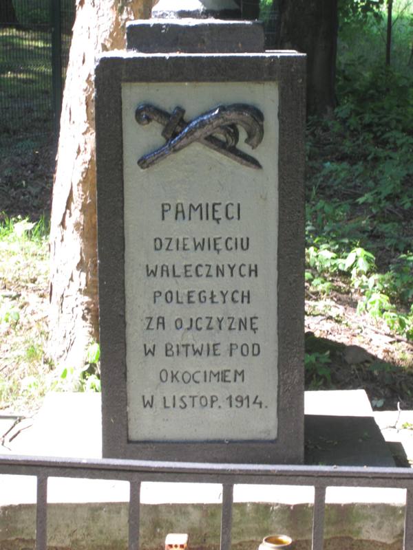 Prostokątna mogiła ziemna w krawężnikowym betonowym obramowaniu, wypełniona żwirem i ogrodzona niskim metalowym płotem. U wezgłowia mogiły na dwustopniowej podstawie znajduje się pomnik w formie postumentu zwieńczonego urną. Na ścianie postumentu od strony mogiły umieszczony jest bagnet skrzyżowany z gałązką palmową oraz napis: „PAMIĘCI/ DZIEWIĘCIU/ WALECZNYCH/ POLEGŁYCH/ ZA OJCZYZNĘ/ W BITWIE POD/ OKOCIMIEM/ W LISTOP. 1914.”. Na bocznych ścianach postumentu wyryte są nazwiska, stopnie wojskowe oraz skróty nazw pułków, do których należeli polegli.