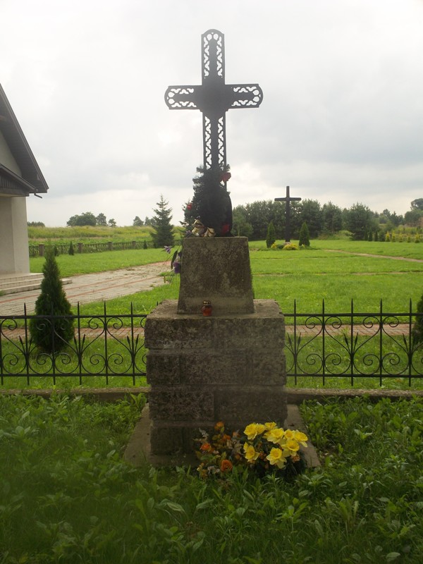 – żeliwnego, ażurowego krzyża, osadzonego na betonowym postumencie, który jest ustawiony na masywnym, prostopadłościennym cokole z betonowych bloczków.