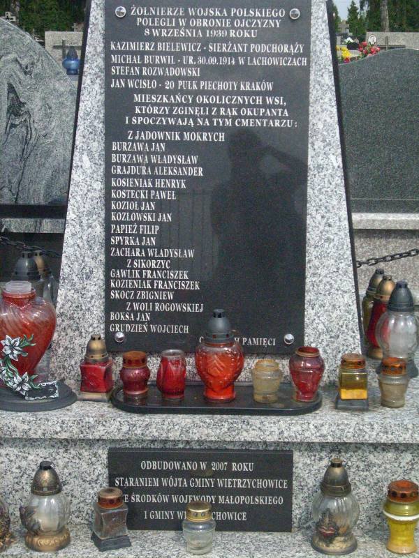 Na mogile znajduje się pomnik w formie ściętego ostrosłupa, osadzonego na dwustopniowej podstawie, zwieńczonego figurą orła. Na frontowej ścianie ostrosłupa umieszczona jest prostokątna tablica z ciemnego kamienia z napisem: „ŻOŁNIERZE WOJSKA POLSKIEGO/ POLEGLI W OBRONIE OJCZYZNY/ 8 WRZEŚNIA 1939 ROKU/ KAZIMIERZ BIELEWICZ – SIERŻANT PODCHORĄŻY/ MICHAŁ BURWIL – UR. 30.09.1914 W LACHOWICZACH/ STEFAN ROZWADOWSKI/ JAN WCISŁO – 20 PUŁK PIECHOTY KRAKÓW/ MIESZKAŃCY OKOLICZNYCH WSI, KTÓRZY ZGINĘLI Z RĄK OKUPANTA I SPOCZYWAJĄ NA TYM CMENTARZU: „ Z JADOWNIK MOKRYCH/ BURZAWA JAN/ BURZAWA WŁADYSŁAW/ GRAJDURA ALEKSANDER/ KOSIENIAK HENRYK/ KOSTECKI PAWEŁ/ KOZIOŁ JAN/ PAPIEŻ FILIP/ SPYRKA JAN/ ZACHARA WŁADYSŁAW/ Z SIKORZYC/ GAWLIK FRANCISZEK/ KOZIENIAK FRANCISZEK/ SKOCZ ZBIGNIEW/ Z WOLI ROGOWSKIEJ/ BOKSA JAN/ GRUDZIEŃ WOJCIECH/ CZEŚĆ ICH PAMIĘCI”. Dalsze nazwiska znajdują się na dwóch tablicach umieszczonych na bocznych ścianach pomnika: