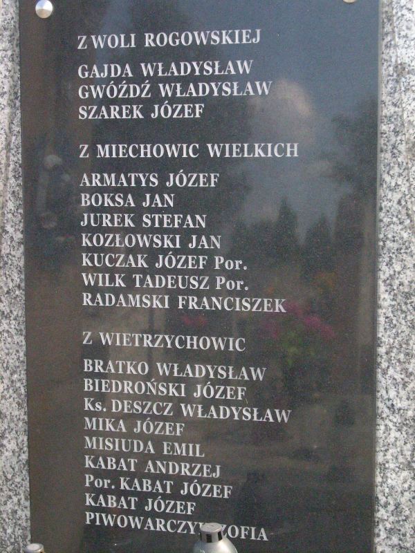 – „Z WOLI ROGOWSKIEJ/ GAJDA WŁADYSŁAW/ GWÓŹDŹ WŁADYSŁAW/ SZAREK JÓZEF/ Z MIECHOWIC WIELKICH/ ARMATYS JÓZEF/ BOKSA JAN/ JUREK STEFAN/ KOZŁOWSKi JA/ KUCZAK JÓZEF Por./ WILK TADEUSZ Por./ RADAMSKI FRANCISZEK/ Z WIETRZYCHOWIC/ BRATKO WŁADYSŁAW/ BIEDROŃSKI JÓZEF/ Ks. DESZCZ WŁADYSŁAW/ MIKA JÓZEF/ MISIUDA EMIL/ KABAT ANDRZEJ/ Por. KABAT JÓZEF/ KABAT JÓZEF/ PIWOWARCZYK ZOFIA”