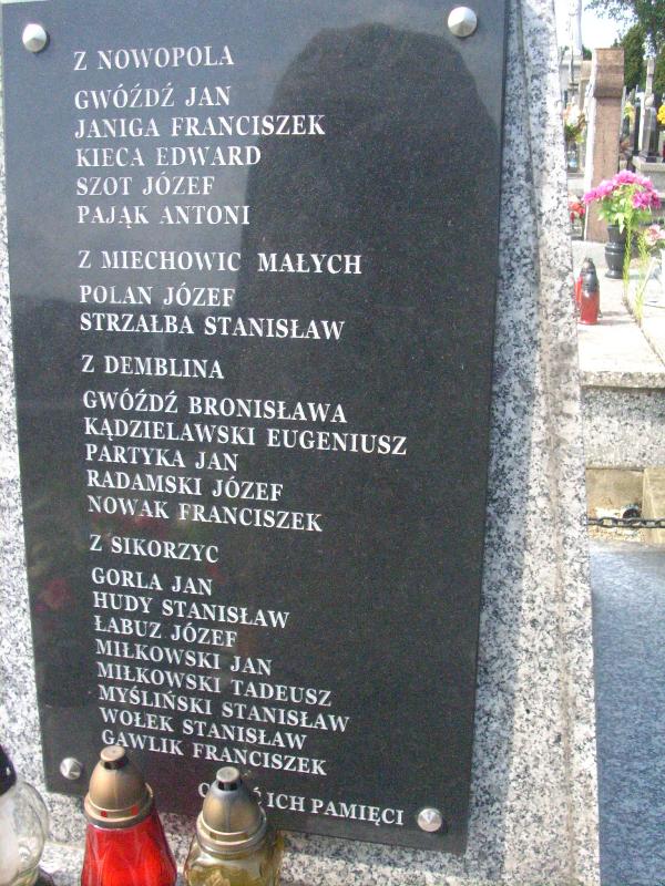 – „Z NOWOPOLA GWÓŹDŹ JAN/ JANIGA FRANCISZEK/ KIECA EDWARD/ SZOT JÓZEF/ PAJĄK ANTONI/ Z MIECHOWIC MAŁYCH/ POLAN JÓZEF/ STRZAŁBA STANISŁAW/ Z DEMBLINA/ GWÓŹDŹ BRONISŁAWA/ KĄDZIELAWSKI EUGENIUSZ/ PARTYKA JAN/ RADAMSKI JÓZEF/ NOWAK FRANCISZEK”.