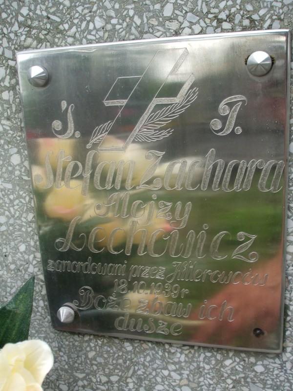 Mogiła ziemna w lastrykowym obramowaniu. U wezgłowia stela w kształcie niesymetrycznego pięcioboku z metalowym krzyżem oraz tabliczką z napisem: „Ś.P./ Stefan Zachara/ Alojzy Lechowicz/ zamordowani przez Hitlerowców/ 18.10.1939 r/ Boże zbaw ich/ dusze”.