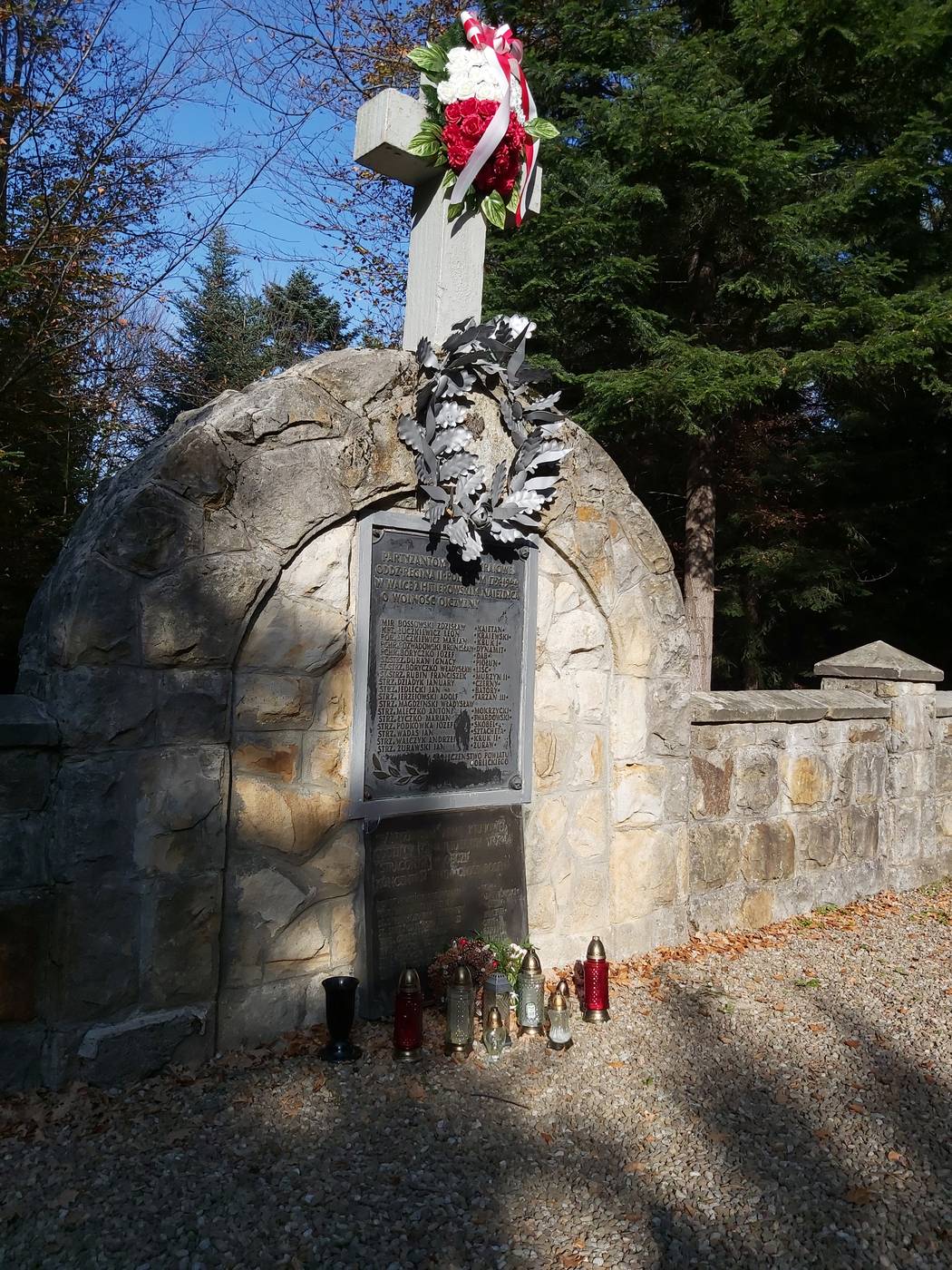 – „PARTYZANTOM ARMII KRAJOWEJ/ ODDZ. REGINA II POLEGŁYM 17 X 1944/ W WALCE Z HITLEROWSKIM NAJEŹDŹCĄ/ O WOLNOŚĆ OJCZYZNY/ MJR BOSSOWSKI ZDZISŁAW ●KAJETAN●/ KPT. ŁUCZKIEWICZ LEON ●KRAJEWSKI●/ POR ŁUCZKIEWICZ MARIAN ●KRUK I●/ PCHR. ROZWADOWSKI BRONISŁAW ●DYNAMIT●/ PCHR. BORYCZKO JÓZEF ●DĄB●/ ST.STRZ. DURAN IGNACY ●PIOŁUN●/ ST. STRZ. BORYCZKO WŁADYSŁAW ●LIŚĆ●/ ST.STRZ. RUBIN FRANCISZEK ●MURZYN II”/ STRZ. DZIADYK JANUARY ●CZERNY●/ STRZ. JEDLECKI JAN ●BATORY●/ STRZ. JĘDRZEJOWSKI ADOLF ●TARZAN III●/ STRZ. MAGDZIŃSKI WŁADYSŁAW/ STRZ. MLECZKO ANTONI ●MOKRZYCKI●/ STRZ. ŁYCZKO MARIAN ●TWARDOWSKI●/ STRZ. PODKÓWKA JÓZEF ●SKOBEL●/ STRZ. WADAS JAN ●SZTACHETA●/ STRZ. WALCZYK ANDRZEJ ●KRUK II●/ STRZ. ŻURAWSKI JAN ●ŻURAW●/ SPOŁECZEŃSTWO POWIATU/ GORLICKIEGO”