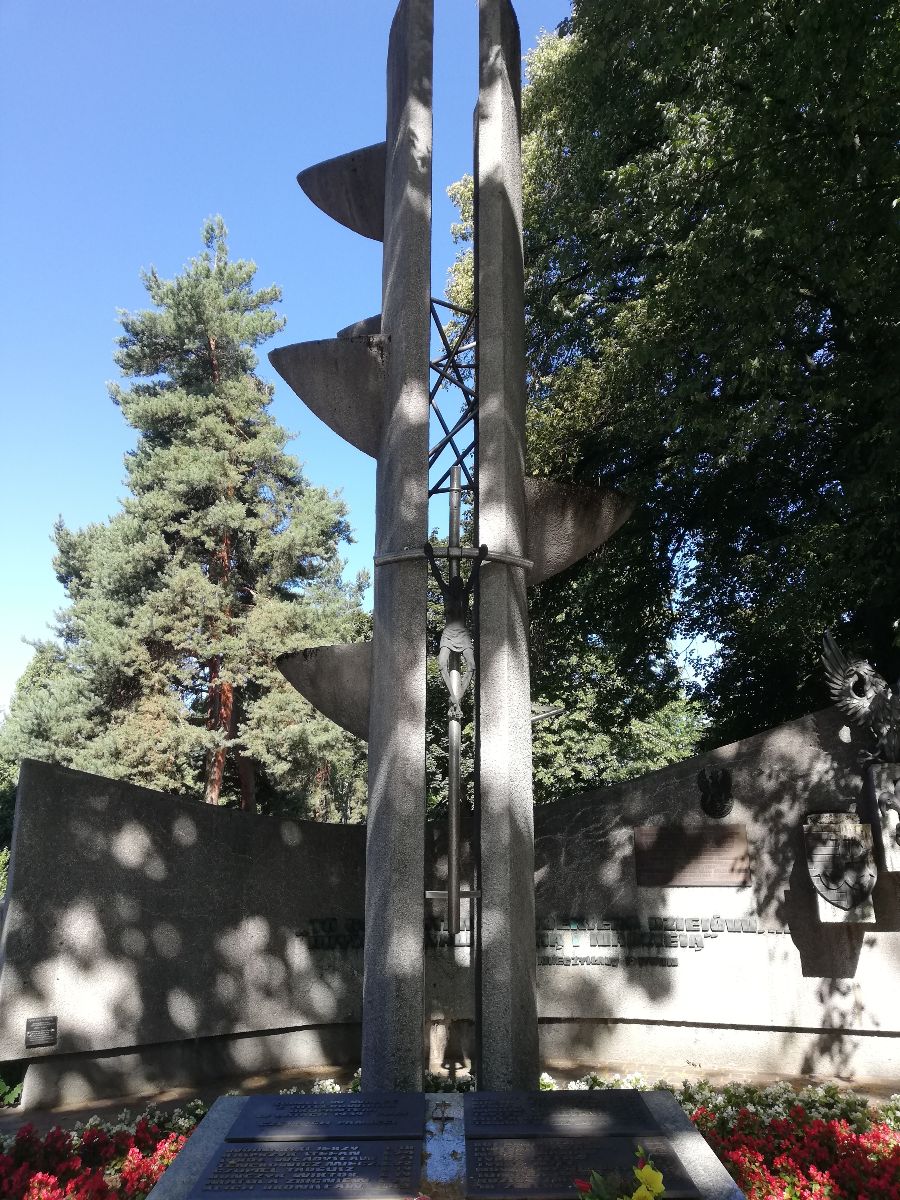 Przed ścianą pomnikową znajduje się pomnik w formie dwóch pylonów, połączonych metalowym krzyżem z figurą Chrystusa. Do pylonów przymocowane są trójkątne płyty.