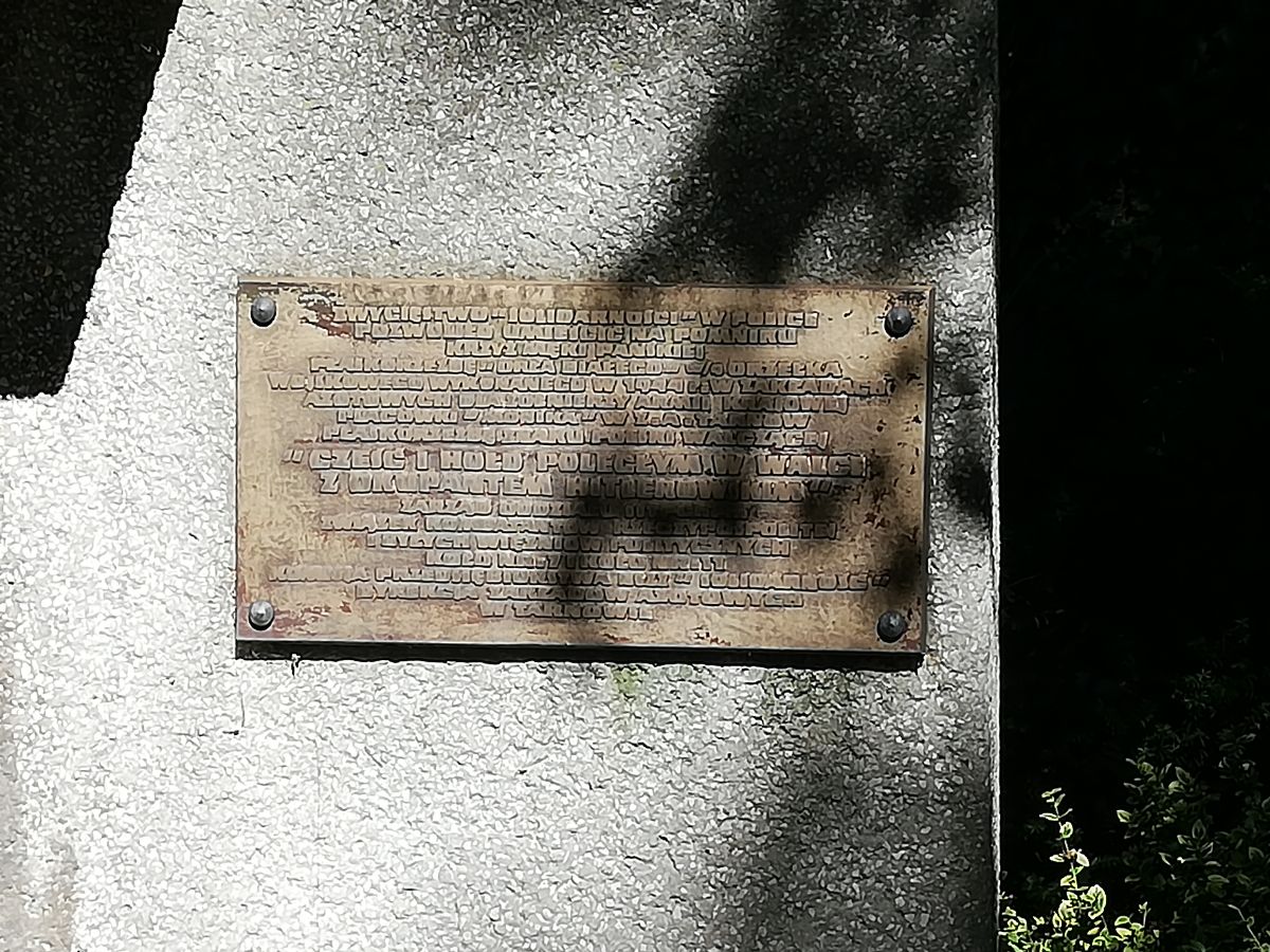 – metalowa tablica z napisem „ZWYCIĘSTWO „SOLIDARNOŚCI” W POLSCE, POZWOLIŁO UMIEŚCIĆ NA POMNIKU/ KRZYŻ MĘKI PAŃSKIEJ/ PŁASKORZEŹBĘ „ORŁA BIAŁEGO” w/g ORZEŁKA/ WOJSKOWEGO WYKONANEGO W 1944 r./ W ZAKŁADACH/ AZOTOWYCH DLA ŻOŁNIERZY ARMII KRAJOWEJ/ PLACÓWKI „MONIKA” W Z.A. TARNÓW/ PŁASKORZEŹBĘ ZNAKU POLSKI WALCZĄCEJ/ „CZEŚĆ I HOŁD POLEGŁYM W WALCE Z OKUPANTEM HITLEROWSKIM”/ ZARZĄD ODDZIAŁU SITPCHem/ ZWIĄZEK KOMBATANTÓW RZECZYPOSPOLITEJ I BYŁYCH WIĘŹNIÓW POLITYCZNYCH/ KOŁO NR. 7 I KOŁO NR. 11/ KOMISJA PRZEDSIĘBIORSTWA NSZZ „SOLIDARNOŚĆ”/ DYREKCJA ZAKŁADÓW AZOTOWYCH/ W TARNOWIE”.