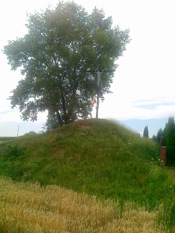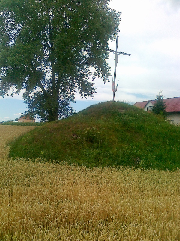Podczas przebudowy drogi w latach 30-tych XX w. natrafiono na szczątki 16 żołnierzy poległych w 1914 r. Szczątki złożono w zbiorowej mogile i usypano na niej kopiec, na którym ustawiony został drewniany krzyż. Na zboczu wykonano kilka betonowych stopni i umieszczono tabliczkę z informacjami o dacie budowy kopca i o pochowanych w mogile osobach.