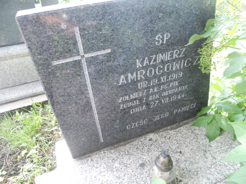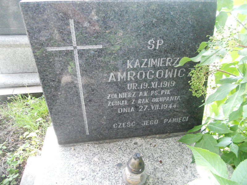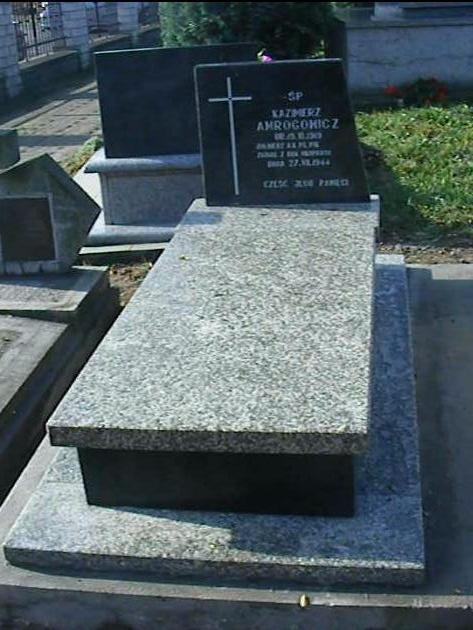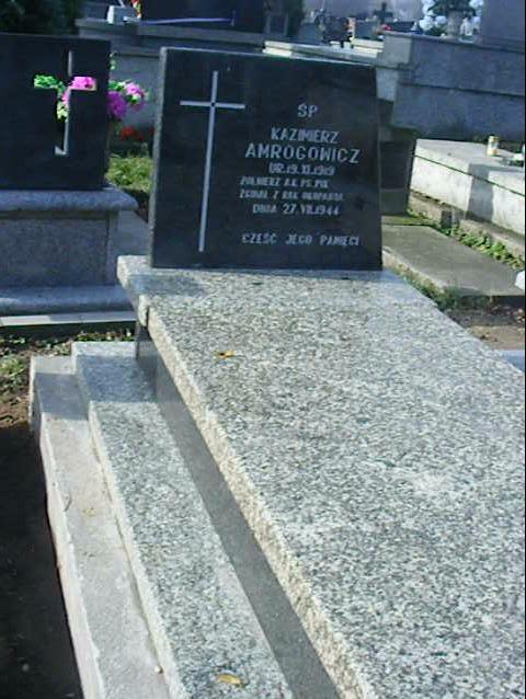 Mogiła obramowa i nakryta kamienną płytą, u wezgłowia granitowa stela z wyrytym krzyżem łacińskim oraz napisem: „Ś.P./ KAZIMIERZ AMROGOWICZ/ UR. 19 X 1918 R/ ZGINĄŁ Z RĄK OKUPANTA/ DN. 27 VII 1944 R./ CZEŚĆ JEGO PAMIĘCI”.