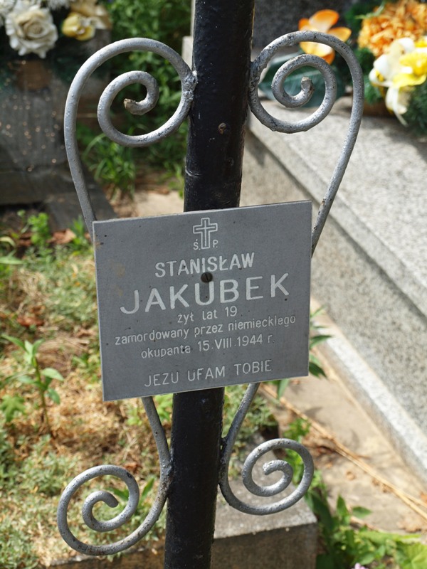Mogiła ziemna w prostokątnym, betonowym obramowaniu, u wezgłowia krzyż z metalowych rur ze zdobieniami z metalowych prętów i pasyjką. Na krzyżu umieszczona jest tabliczka z napisem: „Ś.†P./ STANISŁAW/ JAKUBEK/ żył lat 19/ zamordowany przez niemieckiego/ okupanta 15.VIII.1944 r./ JEZU UFAM TOBIE”.