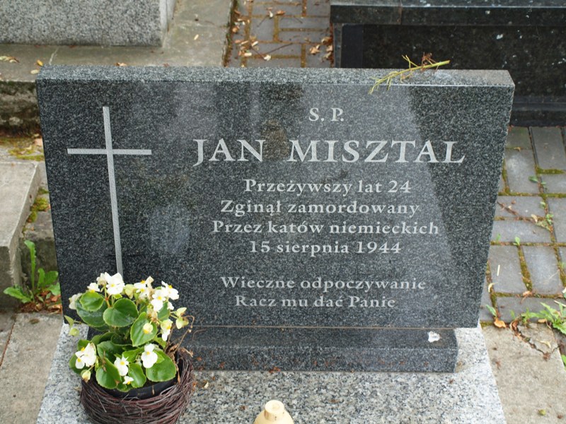 Nagrobek z jasnego granitu, u wezgłowia prostokątna stela z ciemnego granitu z krzyżem łacińskim na licu i napisem: „S.P./ JAN MISZTAL/ Przeżywszy lat 24/ Zginął zamordowany/ Przez katów niemieckich/ 15 sierpnia 1944/ Wieczne odpoczywanie/ Racz mu dać Panie”.