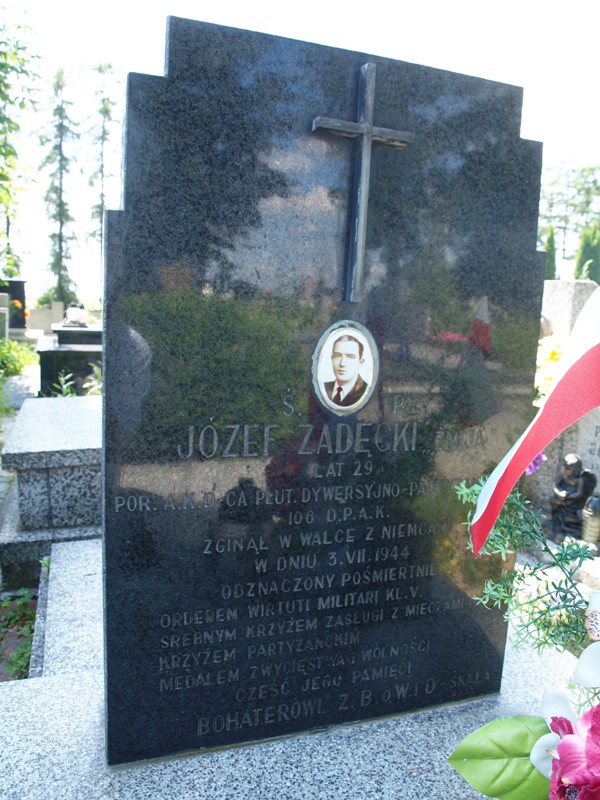 Lastrykowy nagrobek, u wezgłowia stela z ciemnego kamienia z wyciętymi schodkowo narożami. Na licu steli umieszczony jest krzyż łaciński, medalion z fotografią poległego oraz napis: „Ś. P./ JÓZEF ZADĘCKI „ŻMIJA”/ LAT 29/ D-CA PLUT. DYWERSYJNO PARTYZANCKIEGO/ 106 D.P.A.K./ ZGINĄŁ W WALCE Z NIEMCAMI/ W DNIU 3.VII.1944/ ODZNACZONY POŚMIERTNIE ORDEREM WIRTUTI MILITARI KL. V./ SREBRNYM KRZYŻEM ZASŁUGI Z MIECZAMI/ KRZYŻEM PARTYZANCKIM/ MEDALEM ZWYCIĘSTWA I WOLNOŚCI/ CZEŚĆ JEGO PAMIĘCI/ BOHATEROWI Z.B.O.W.i D.”