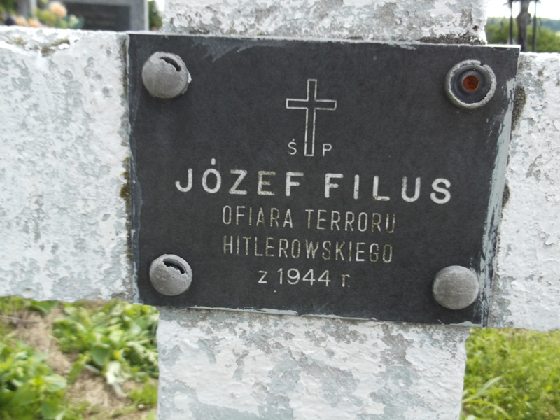 Mogiła ziemna w prostokątnym, betonowym obramowaniu. U wezgłowia mogiły znajduje się betonowy krzyż z tabliczką z napisem: „چP/ JÓZEF/ FILUS/ OFIARA TERRORU/ HITLEROWSKIEGO/ Z 1944 r.” oraz krzyż z metalowych rur z promienistą glorią i pasyjką. Na poprzedniej tabliczce na krzyżu betonowym widniała data „1943 r.”
