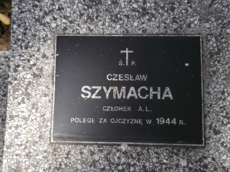 Mogiła ziemna w betonowym obramowaniu, nakryta lastrykową płytą, u wezgłowia lastrykowy, prostopadłościenny blok z tabliczką z napisem: „Ś.†P./ CZESŁAW/ SZYMACHA/ CZŁONEK A.L./ POLEGŁ ZA OJCZYZNĘ W 1944 R.”