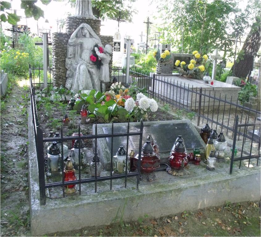 Mogiła ziemna, założona na planie prostokąta i otoczona płotem z metalowych prętów na betonowej podmurówce. U wezgłowia mogiły znajduje się wysoki postument ze spojonych zaprawą otoczaków, zwieńczony figurą Chrystusa. Przed frontową ścianą postumentu umieszczone są dwie figury przedstawiające postacie kobiety i dziecka. Po obu stronach postumentu znajdują się kwietniki na wysokich filarach z metalowych rur.