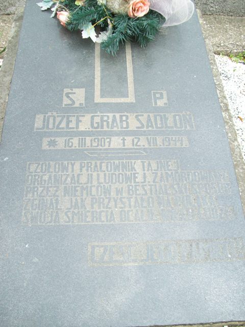 „Ś. P./ JÓZEF „GRAB” SADŁOŃ/ * 16.III.1907 † 12.VII.1944./ CZOŁOWY PRACOWNIK TAJNEJ/ ORGANIZACJI LUDOWEJ. ZAMORDOWANY/ PRZEZ NIEMCÓW W BESTIALSKI SPOSÓB./ ZGINĄŁ JAK PRZYSTAŁO NA POLAKA/ SWOJĄ ŚMIERCIĄ OCALIŁ WIELU LUDZI/ CZEŚĆ JEGO PAMIĘCI”.