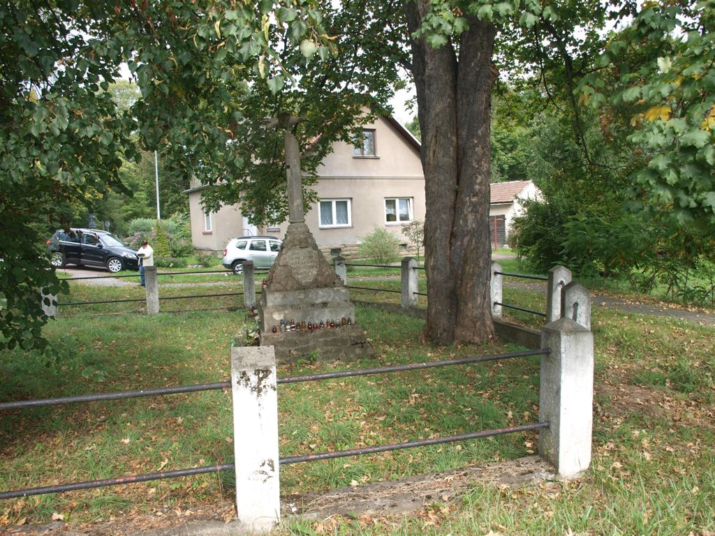 – żeliwnego krzyża łacińskiego z tarczą na skrzyżowaniu ramion na betonowym postumencie.