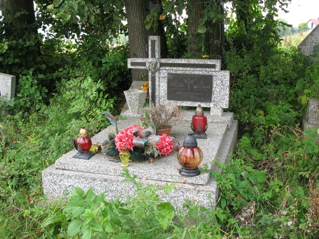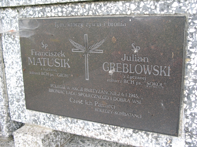 Mogiła obramowana i nakryta lastrykową płytą. U wezgłowia lastrykowy krzyż z metalowym medalionem z wizerunkiem głowy Chrystusa oraz prostokątna stela z umieszczoną na licu tablicą memoratywną z napisem: „Tym, którzy żywią i bronią/ Śp/ Franciszek MATUSIK/ z Łyczanej/ żołnierz BCH ps. „GROM”/ Śp JULIAN GRĘBLOWSKI/ z Łyczanej/ żołnierz BCH ps. „SOKÓŁ”/ POLEGLI W AKCJI PARTYZANCKIEJ 6 I 1945/ BRONIĄC ŁADU SPOŁECZNEGO I DOBRA WSI/ Cześć Ich Pamięci/ KOLEDZY-KOMBATANCI”.