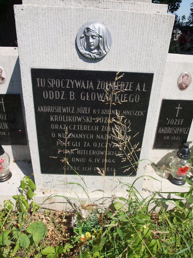 Mogiła ziemna w betonowym, krawężnikowym obramowaniu. U wezgłowia mogiły znajduje się betonowy, prostopadłościenny postument zwieńczony rzeźbą przedstawiającą orła. Na frontowej ścianie postumentu umieszczony jest okrągły, metalowy medalion przedstawiający twarz kobiety oraz czarna tablica z napisem: „TU SPOCZYWAJĄ ŻOŁNIERZE A.L./ ODDZ. B. GŁOWACKIEGO/ ANDRUSIEWICZ JÓZEF K-T DZIELNICY „MNISZEK”/ KRÓLIKOWSKI JÓZEF Z-CA./ ORAZ CZTERECH ŻOŁNIERZY/ O NIEZNANYCH NAZWISKACH/ POLEGLI ZA OJCZYZNĘ/ Z RĄK HITLEROWSKICH/ W DNIU 4.IV.1944/ CZĘŚĆ ICH PAMIĘCI.” Do postumentu przylegają po obu stronach betonowe stele ze zdjęciami pochowanych i tablicami z napisami: