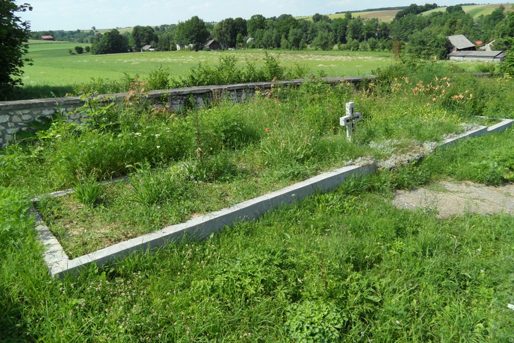 Mogiła ziemna w podłużnym, prostokątnym, betonowym obramowaniu. W środkowej części mogiły znajduje się niski lastrykowy krzyż z metalową pasyjką. U podstawy krzyża umieszczona jest tablica z napisem: „GRÓB POLEGŁYCH NA II WOJNIE ŚWIATOWEJ”.
