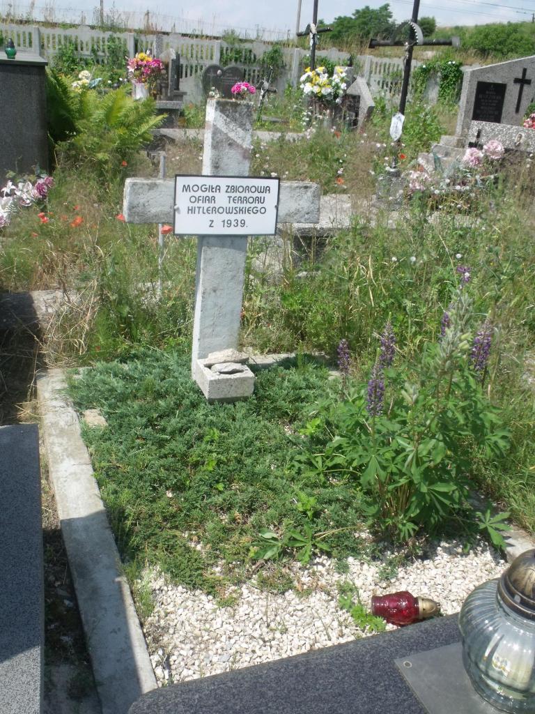 Mogiła ziemna w betonowym obramowaniu, u wezgłowia betonowy krzyż łaciński z prostokątną tablicą z napisem „MOGIŁA ZBIOROWA/ OFIAR TERRORU HITLEROWSKIEGO/ Z 1939 R.”