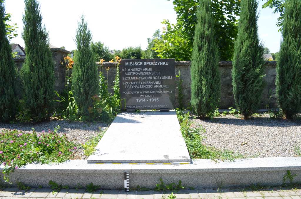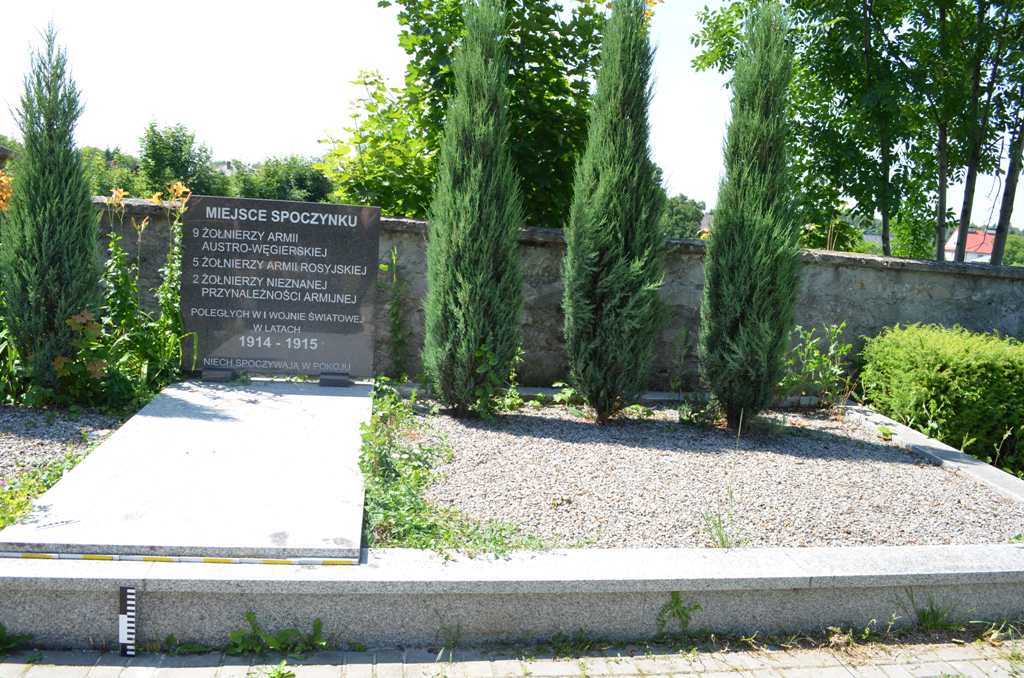 Mogiła ziemna w szerokim, granitowym obramowaniu. Przez środek mogiły przełożona jest granitowa płyta. U jej wezgłowia znajduje się prostokątna stela z ciemnego kamienia z napisem: „MIEJSCE SPOCZYNKU/ 9 ŻOŁNIERZY ARMII/ AUSTRO-WĘGIERSKIEJ/ 5 ŻOŁNIERZY ARMII ROSYJSKIEJ/ 2 ŻOŁNIERZY NIEZNANEJ/ PRZYNALEŻNOŚCI ARMIJNEJ/ POLEGŁYCH W I WOJNIE ŚWIATOWEJ/ W LATACH/ 1914 – 1915/ NIECH SPOCZYWAJĄ W POKOJU”.
