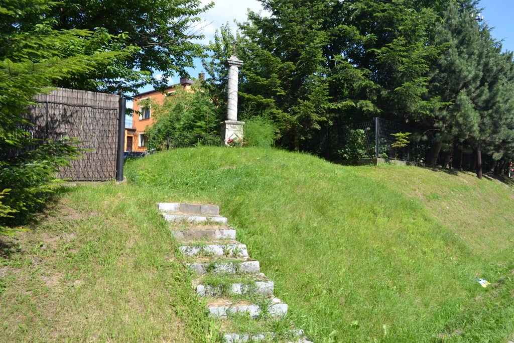 Pomnik usytuowany jest na niewielkim ziemnym kopcu i ma formę zwieńczonej metalowym krzyżem kolumny z piaskowca na prostopadłościennym postumencie. Według miejscowej tradycji w tym miejscu pochowano powstańców z 1863 r.