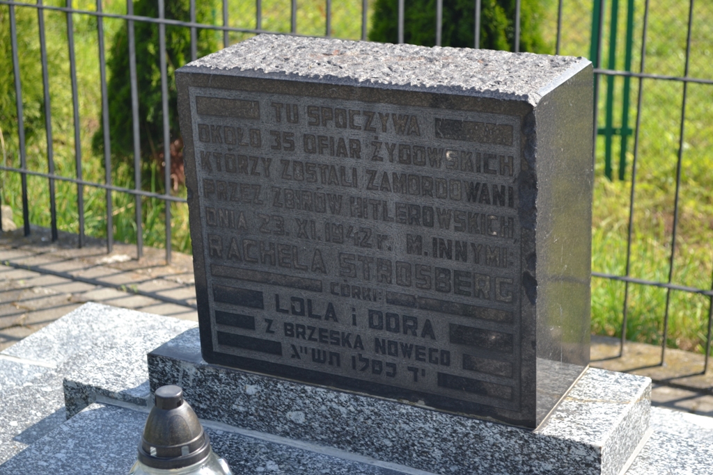 Drugi z pomników ma formę kamiennego nagrobka, nakrytego trzema płytami. U jego wezgłowia znajduje się prostokątna stela z napisem: „TU SPOCZYWA/ OKOŁO 35 OFIAR ŻYDOWSKICH/ KTÓRZY ZOSTALI ZAMORDOWANI/ PRZEZ ZBIRÓW HITLEROWSKICH/ DNIA 23.XI.1942 r. M.INNYMI:/ RACHELA STROSBERG/ CÓRKI LOLA i DORA/ Z BRZESKA NOWEGO”. W dolnej części tablicy znajduje się napis w języku hebrajskim. Otoczenie mogiły wyłożone jest płytami chodnikowymi.