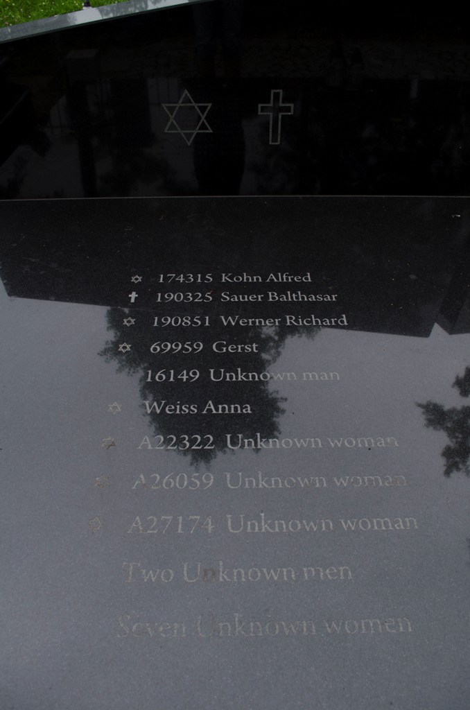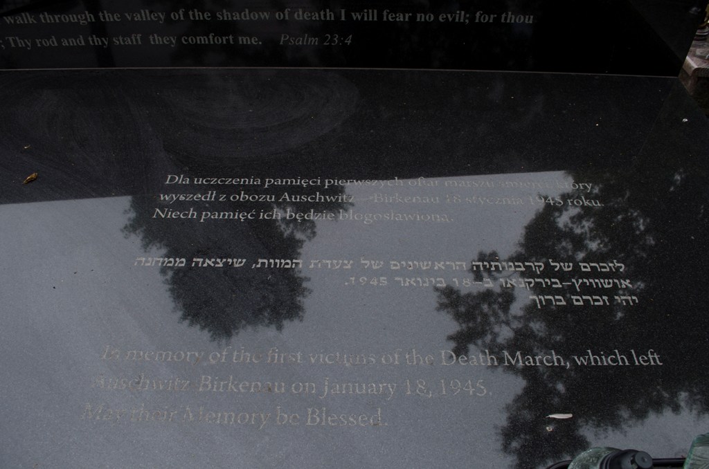 Na lewej części płyty nagrobnej wyryta jest lista pochowanych ze wskazaniem numeru obozowego imienia i nazwiska, jeśli zostały ustalone, oraz Gwiazdy Dawida lub krzyża łacińskiego: „174315 Kohn Alfred/ 190325 Sauer Balthasar/ 190851 Werner Richard/ 69959 Gerst/ 16149 Unknown man/ Weiss Anna/ A22322 Unknown woman/ A26059 Unknown woman/ A27174 Unknown woman/ Two Unknown men/ Seven Unknown women”. Na płycie nagrobnej znajduje się napis nagrobny w języku polskim, hebrajskim i angielskim: „Dla uczczenia pamięci ofiar marszu śmierci, który/ wyszedł z obozu Auschwitz–Birkenau 18 stycznia 1945 roku. Niech pamięć ich będzie błogosławiona.” Otoczenie mogiły wyłożone jest kostką brukową.