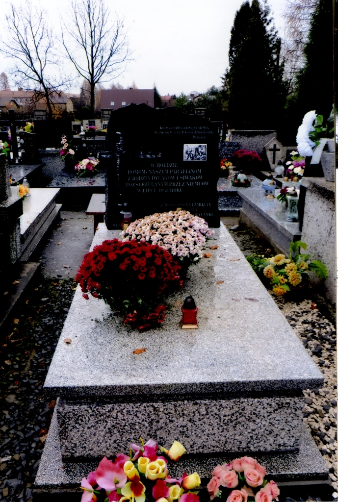 >> "Kto was widzi, ten wojny się nie boi/ bo znowu w oczach ma ją dzisiaj całą" PAPUSZA/ W HOŁDZIE/ ROMOM - NASZYM PARAFIANOM Z RODZIN DYLĄGÓW I SIWAKÓW/ ROZSTRZELANYM PRZEZ NIEMCÓW/ W LIPCU 1943 ROKU./ Z MODLITEWNĄ PAMIĘCIĄ/ MIESZKAŃCY/ DOMINIKOWIC i KOBYLANKA/ 01 Listopada 2015r. << Na steli umieszczony jest motywe krzyża i zdjęcie rodziny romskiej.