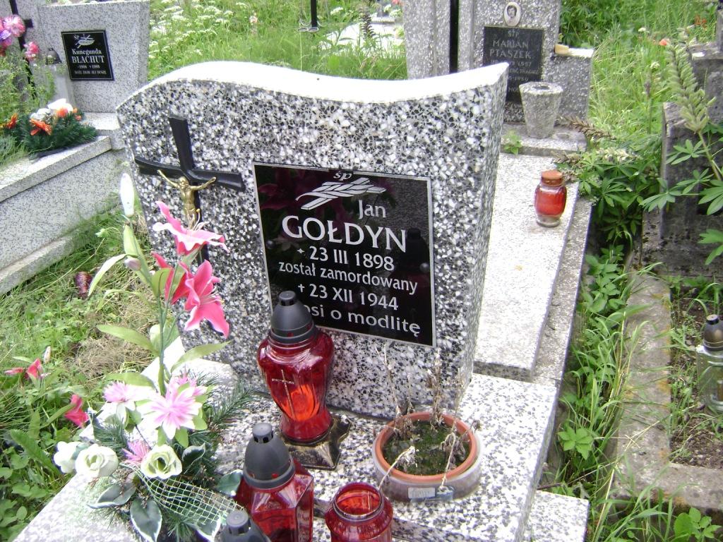 Na mogile lastrykowy nagrobek, u wezgłowia lastrykowa stela zwężająca się ku dołowi o wygiętej górnej krawędzi. Na licu steli umieszczony jest czarny krzyż łaciński z pasyjką w kolorze złotym oraz tablica z napisem: „JAN GOŁDYN/ 23 III 1898/ został zamordowany/ 23 XII 1944/ Prosi o modlitwę".