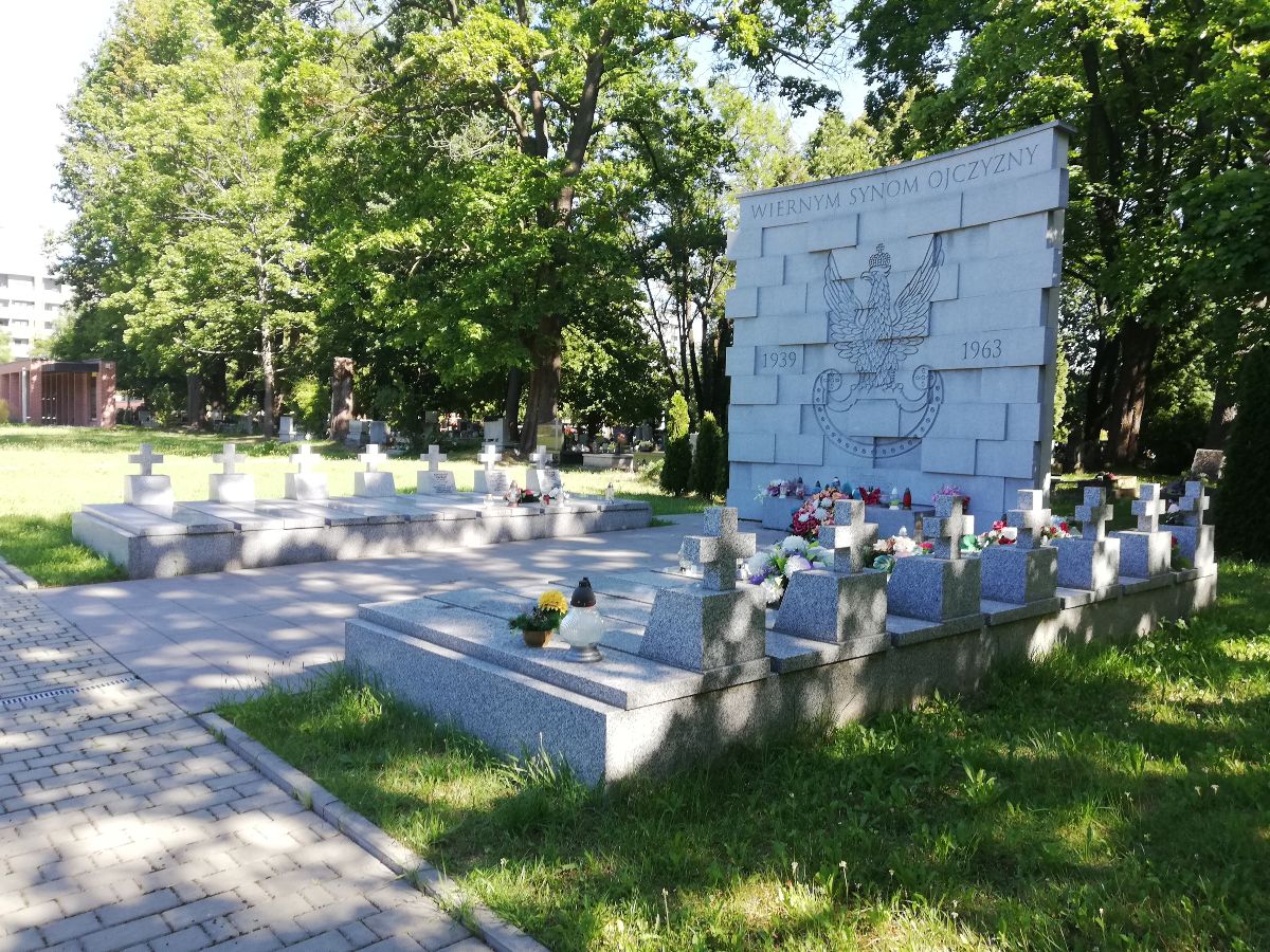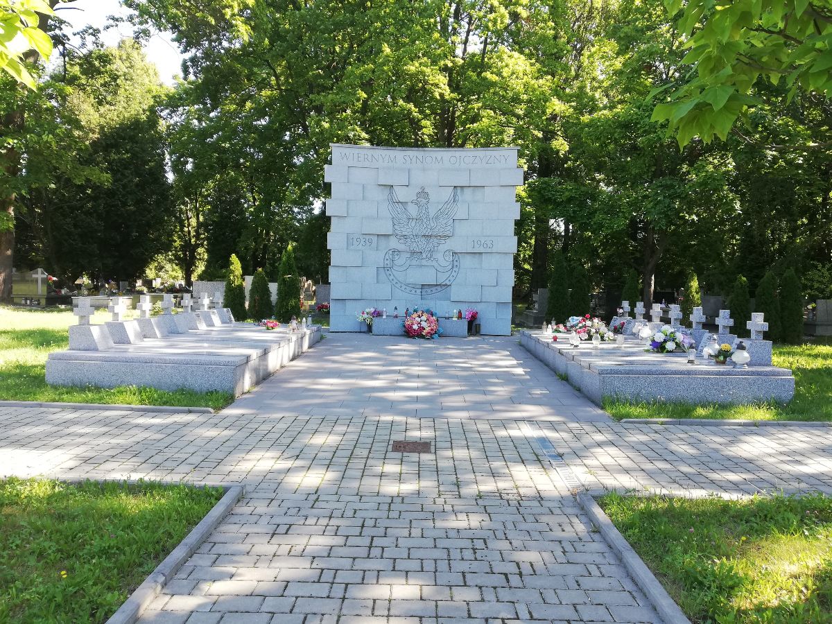 Kwatera założona jest na planie czworoboku i podzielona wyłożoną płytami chodnikowymi alejką na dwie części. Główny akcent architektoniczny to zamykająca alejkę ściana pomnikowa z licem stylizowanym na wysunięte do przodu kamienne bloki muru, wyrytym orłem wojskowym, datami „1939 1963” oraz napisem „WIERNYM SYNOM OJCZYZNY”. Poniżej orła wyryte są słowa ks. Władysława Gurgacza: „KAŻDA KROPLA KRWI/ NIEWINNIE PRZELANEJ/ ZRODZI TYSIĄCE PRZECIWNIKÓW/ i OBRÓCI SIĘ WAM NA ZGUBĘ”.