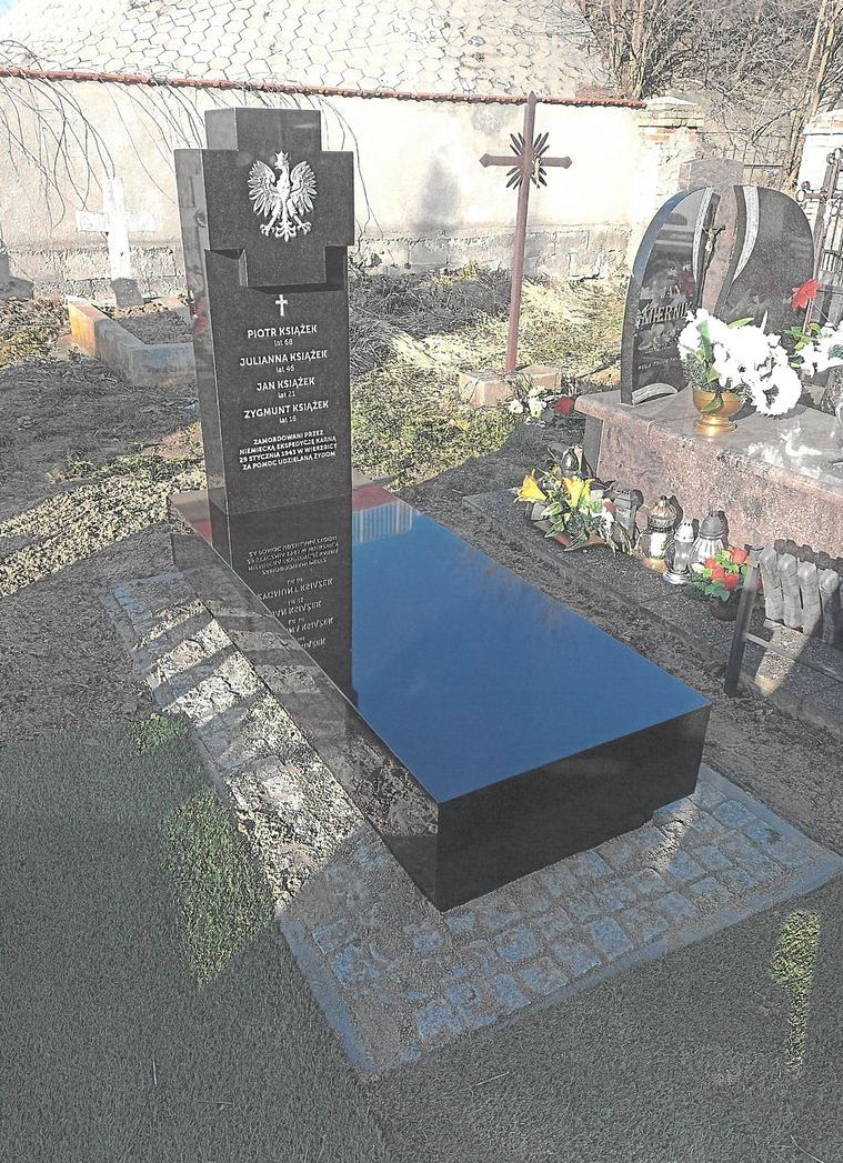 Na mogile nagrobek z czarnego granitu, z attyką u wezgłowia z ryzalitowanym równoramiennym krzyżem, na którym umieszczony jest odlew wizerunku orła z godła państwowego. Poniżej krzyża widnieje inskrypcja „†/ PIOTR KSIĄŻĘK/ lat 68/ JULIANNA KSIĄŻEK/ lat 46/ JAN KSIĄŻEK/ lat 21/ ZYGMUNT KSIĄŻEK/ lat 18/ ZAMORDOWANI PRZEZ/ NIEMIECKĄ EKSPEDYCJĘ KARNĄ/ 29 STYCZNIA 1943 W WIERZBICY/ ZA POMOC UDZIELANĄ/ ŻYDOM".