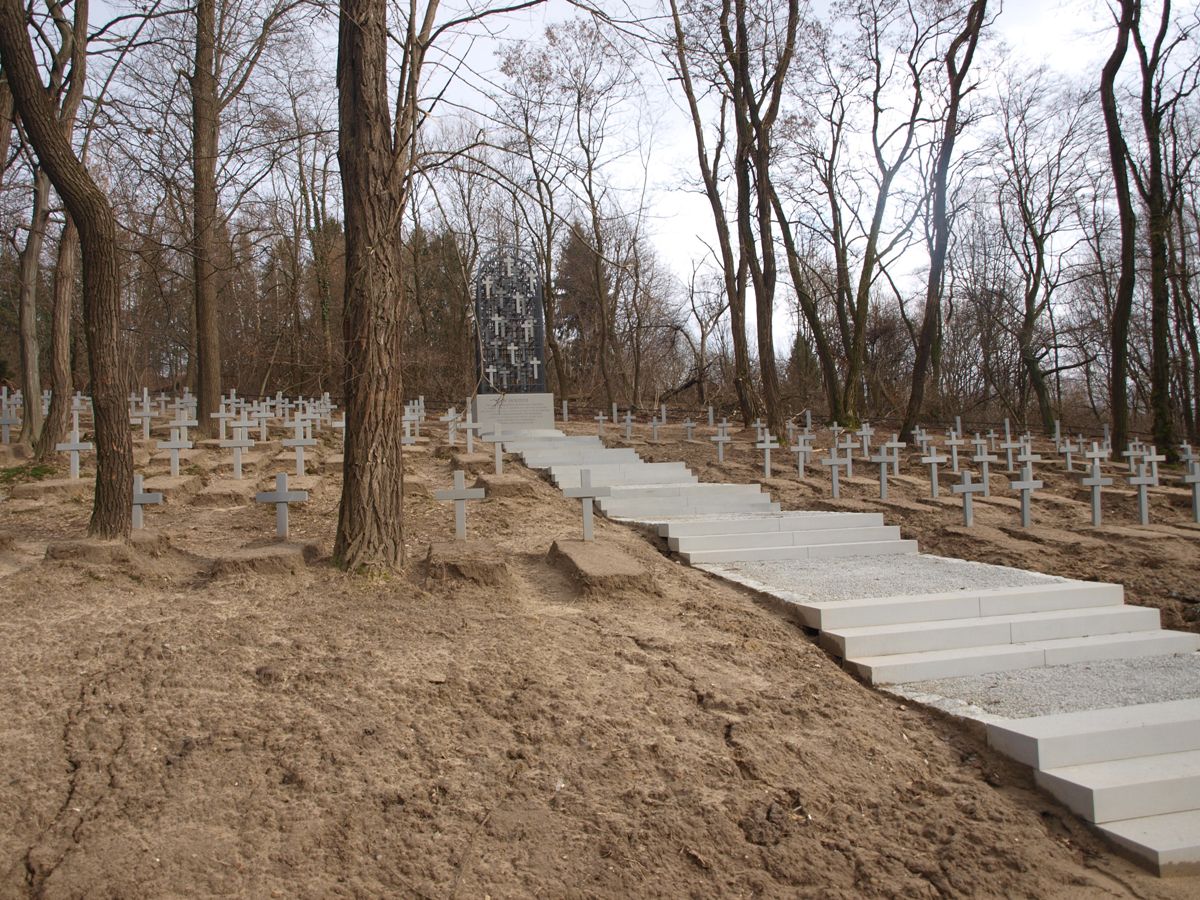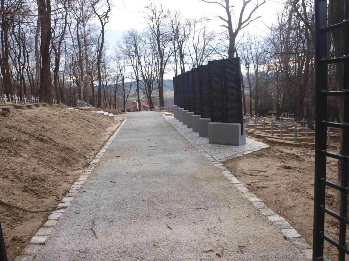 Główną aleję cmentarza zamyka wysoki krzyż z belek z połączonych ze sobą dwóch metalowych rur. Po lewej stronie końcowego odcinka głównej alei usytuowanych jest ściętych pulpitowo pięć bloków z piaskowca z wyrytymi inskrypcjami: