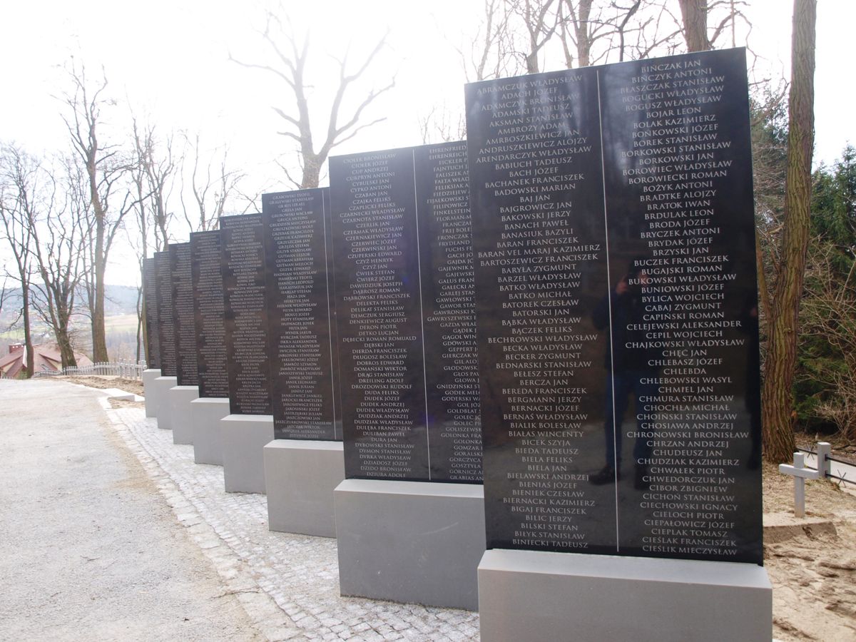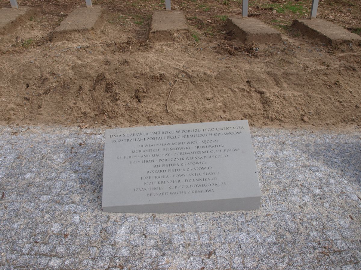 - „DNIA 5 WRZEŚNIA 1940 ROKU W POBLIŻU TEGO CMENTARZA/ ROZSTRZELANI ZOSTALI PRZEZ NIEMIECKICH OPRAWCÓW:/ DR WŁADYSŁAW BOBILEWICZ – SĘDZIA;/ MGR ANDRZEJ BIEŃKOWSKI PROKURATOR;/ KS. FERDYNAND MACHAY – ZGROMADZENIE O. FILIPINÓW;/ JERZY LIBAN – PORUCZNIK WOJSKA POLSKIEGO;/ JAN PISTUŁA Z KATOWIC;/ RYSZARD PISTUŁA Z KATOWIC;/ JÓZEF KANIA – POWSTANIEC ŚLĄSKI;/ JÓZEF KRENZLER – DZIENNIKARZ/ IZAAK UNGER – KUPIEC Z NOWEGO SĄCZA;/ BERNARD WACHS Z KRAKOWA.”