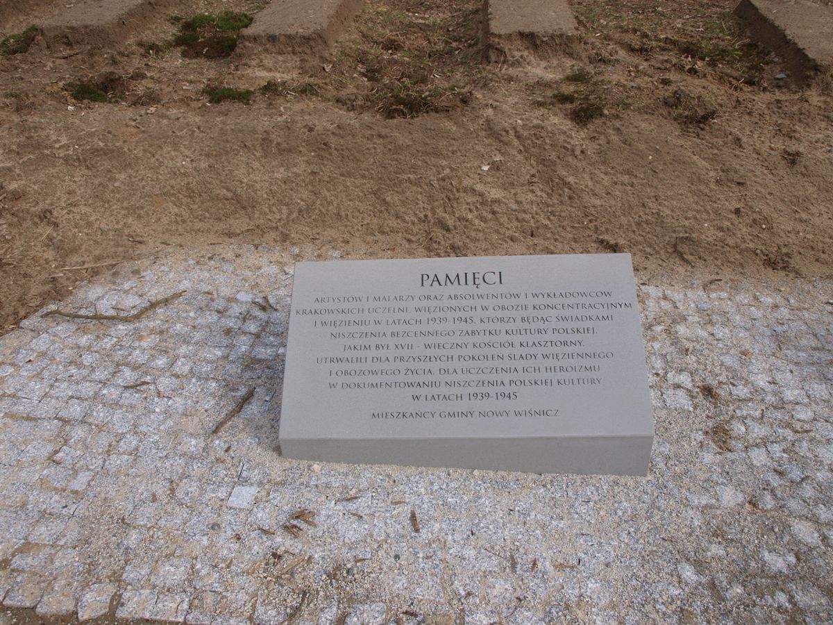 - „PAMIĘCI/ ARTYSTÓW I MALARZY ORAZ ABSOLWENTÓW I WYKŁADOWCÓW/ KRAKOWSKICH UCZELNI, WIĘZIONYCH W OBOZIE KONCENTRACYJNYM/ I WIĘZIENIU W LATACH 1939-1945, KTÓRZY BĘDĄC ŚWIADKAMI/ NISZCZENIA BEZCENNEGO ZABYTKU KULTURY POLSKIEJ,/ JAKIM BYŁ XVII – WIECZNY KOŚCIÓŁ KLASZTORNY,/ UTRWALILI DLA PRZYSZŁYCH POKOLEŃ ŚLADY WIĘZIENNEGO/ I OBOZOWEGO ŻYCIA DLA UCZCZENIA ICH HEROIZMU/ W DOKUMENTOWANIU NISZCZENIA POLSKIEJ KULTURY/ W LATACH 1939-1945/ MIESZKAŃCY GMINY NOWY WIŚNICZ”