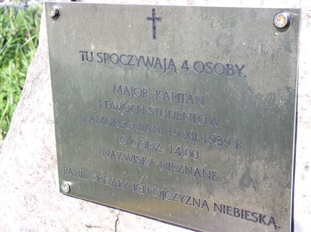Mogiła ziemna otoczona kamieniami. Głównym elementem jest zwieńczony małym metalowym krzyżem głaz. Umieszczono na nim tablicę z napisem „TU SPOCZYWAJĄ 4 OSOBY/ MAJOR KAPITAN/ I DWÓCH STUDENTÓW/ ZAMORDOWANI 19 XII 1939 R./ O GODZ. 14 00/ NAZWISKA NIEZNANE/ PANIE OBDARZ ICH OJCZYZNĄ NIEBIESKĄ”