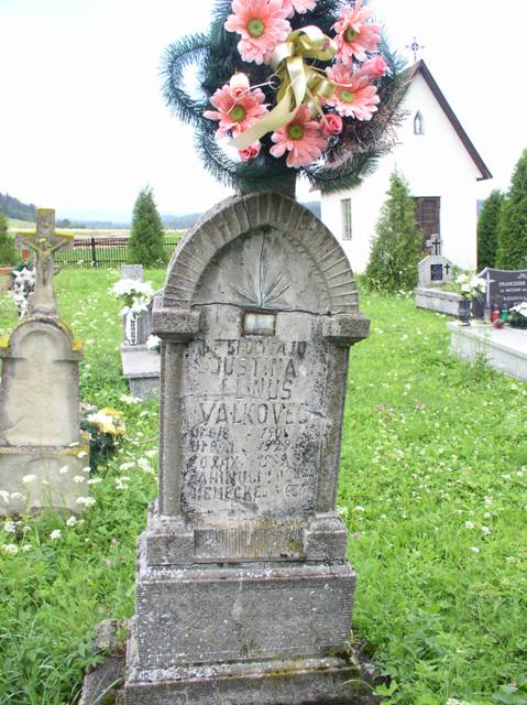 „TU SPOCIVAJU// JUSTINA// I LINUS// VALKOVEC// Ur. 8/VIII. 1908.//Ur. 8/XI.1929.//ZO 2/9.1939.// ZAHINULI POCIAS// NIEMECKIEJ VOJNI//"