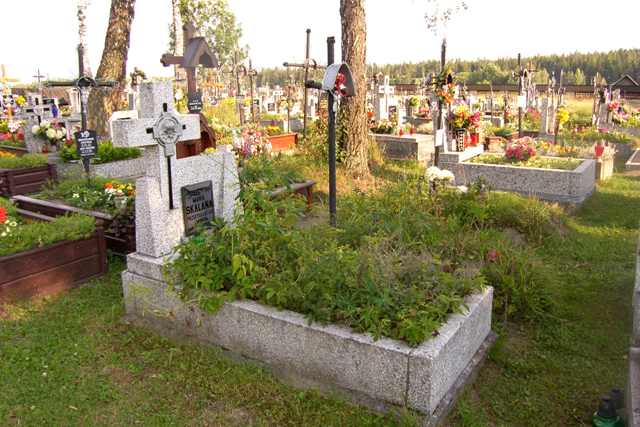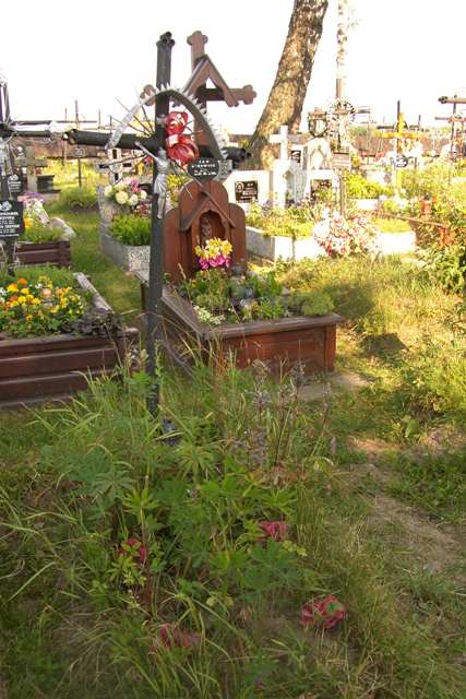 Mogiła ziemna. U wezgłowia znajduje się metalowy krzyż z ozdobnymi zakończeniami ramion i figurą Chrystusa. Nad skrzyżowaniem ramion półkoliste zadaszenie.