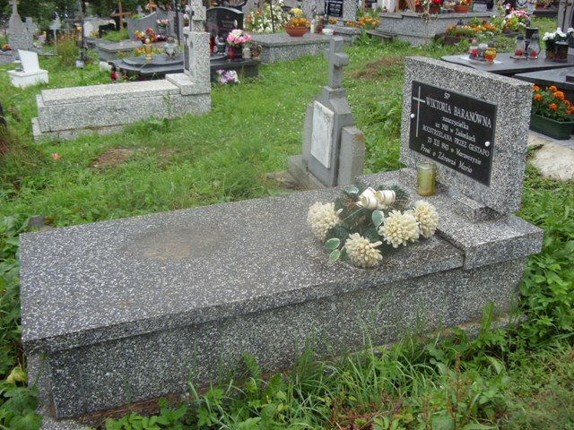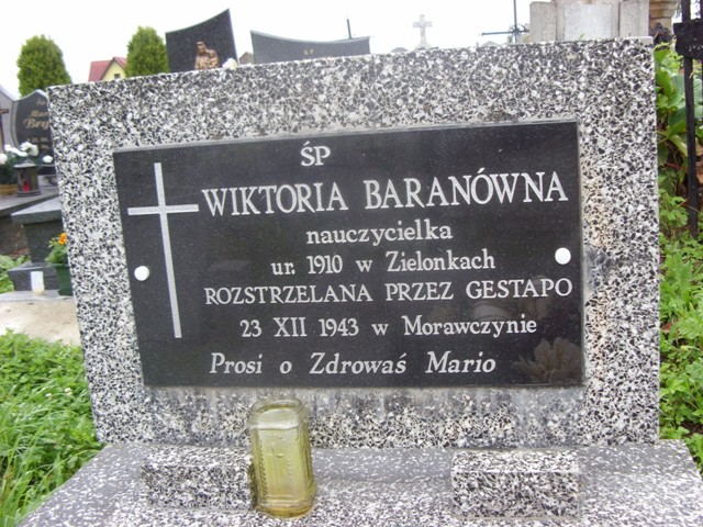 „ŚP/ WIKTORIA BARANÓWNA/ ur. 1910 w Zielonkach/ ROZSTRZELANA PRZEZ GESTAPO/ 23 XII 1943 w Morawczynie/ Prosi o Zdrowaś Mario”